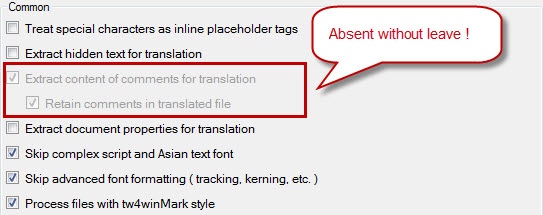 Things have definitely changed. The “retain comments” feature is greyed out AND enabled. Previously it was greyed out AND disabled. When I say “greyed out” I mean that it’s not possible to change this setting. The other reason why I think it has been brought back is very simple: when I open my translated file, I see my comments (just like with external review documents) – this wasn’t the case before CU12.