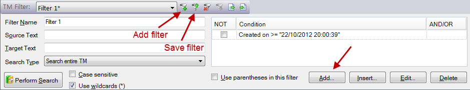 I thought it would be useful to add a field in my TM to identify where these new units have come from, so I opened my TM in the Translation Memory window in Studio and added a filter by clicking: Add filter>Add>[Field:] Created on>Greater than or equal to [I entered the date and time I added the .tmx]>OK>Perform Search. Then I saved the filter (click save filter). You’ll see the asterisk beside the filter disappears after saving.