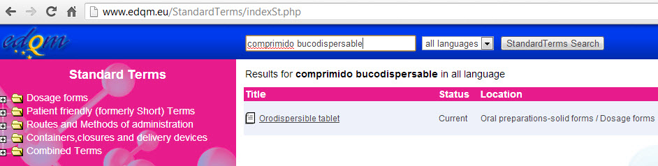 - Click Alt+3 to select EDQM Standard Terms* and the page comes up in your browser. Solution: “orodispersible tablet”