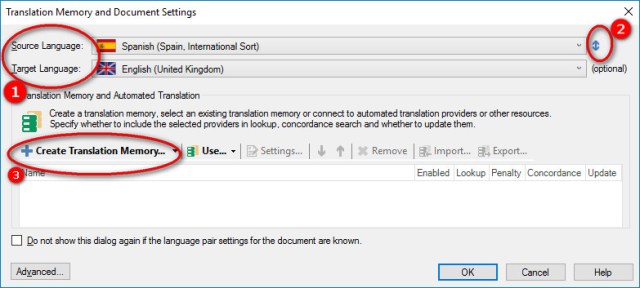 - Tick the character-based concordance search if you want to search your TM by groups of characters. It’s useful for small TMs but results can get fuzzy if your TM grows very big. Unfortunately you can’t change this setting later. In Studio 2017/2019, click the box below too, “Support Fragment Alignment“.