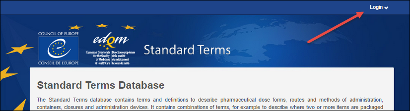- When you receive the new Standard Terms password, go to https://standardterms.edqm.eu and enter your email and new password. The login area is tucked up at the top of your screen: