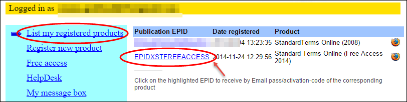 - Now go to “List my registered products”. Under “Publication EPID”, click the long ID for Standard Terms Online (Free Access 2014) and wait for a new email.