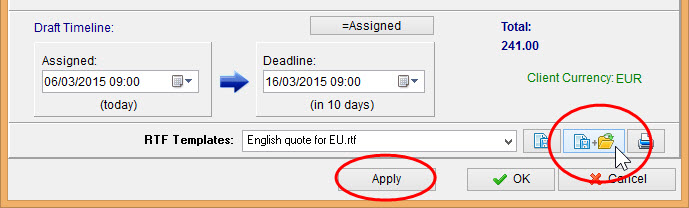 Click OK. The Volume field will show the final price. Click OK to return to the New Client Quote window. Click Apply and then Save and Open (see screenshot below) to save the quote in your chosen folder and open it in Word.