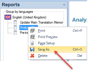 After running an analysis on your file(s), select the project, go to the Reports’ view, right-click Analyze Files and select Save As. Save the analysis as an .xml file.