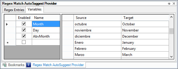 The trick is to define months as variables and pretranslate them under the Variables tab in Regex Match AutoSuggest Provider:
