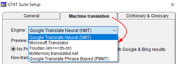 Under Language Pair in the menu, you can reach the setup options to choose from a number of MT engines, including Google Translate PBMT (phrase-based MT) and Google Translate NMT (neural MT). Dictionary look-up and glossary features are also available in GT4T.