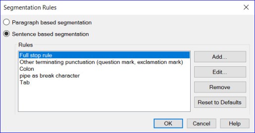 Segmentation Rules. The choice between paragraph and sentence based segmentation is fairly clear. If Studio segments your text only when it comes to a paragraph mark, segments will be too long. Paragraph segmentation might be worth considering if you need to restructure ideas within a paragraph, but remember that the setting is implemented before you open the file in the Editor window, and it applies to the whole file.