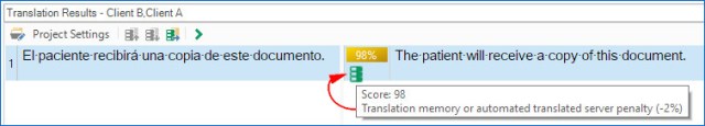 A 100% match in the penalised TM will now be shown as 98% in the Translation Results window, which will alert me to check it carefully to see if I can use it as is for my current project.