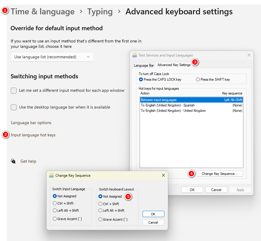 Tweak the keyboard language layout in the steps above. To quickly switch from one layout to another, press Win key+spacebar to toggle through the languages. If Windows uses another shortcut (such as Ctrl+shift) that clashes with other shortcuts, switch it here: