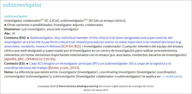 When you have doubts with ES-EN clinical trial terminology, be sure to check out the latest addition to Cosnautas, Diccionario inglés-español de investigación clínica, compiled by M.ª Verónica Saladrigas. Although it’s designed for into-Spanish translators, the dictionary is still valuable for reverse searches because many entries come with additional context and references to original sources, such as specific regulations and other publications.