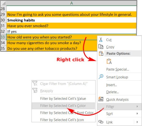 In Excel, I set up a filter to display only the cells with orange fill. To do this, I right clicked one of the orange cells and selected Filter > Filter by Selected Cell’s Color
