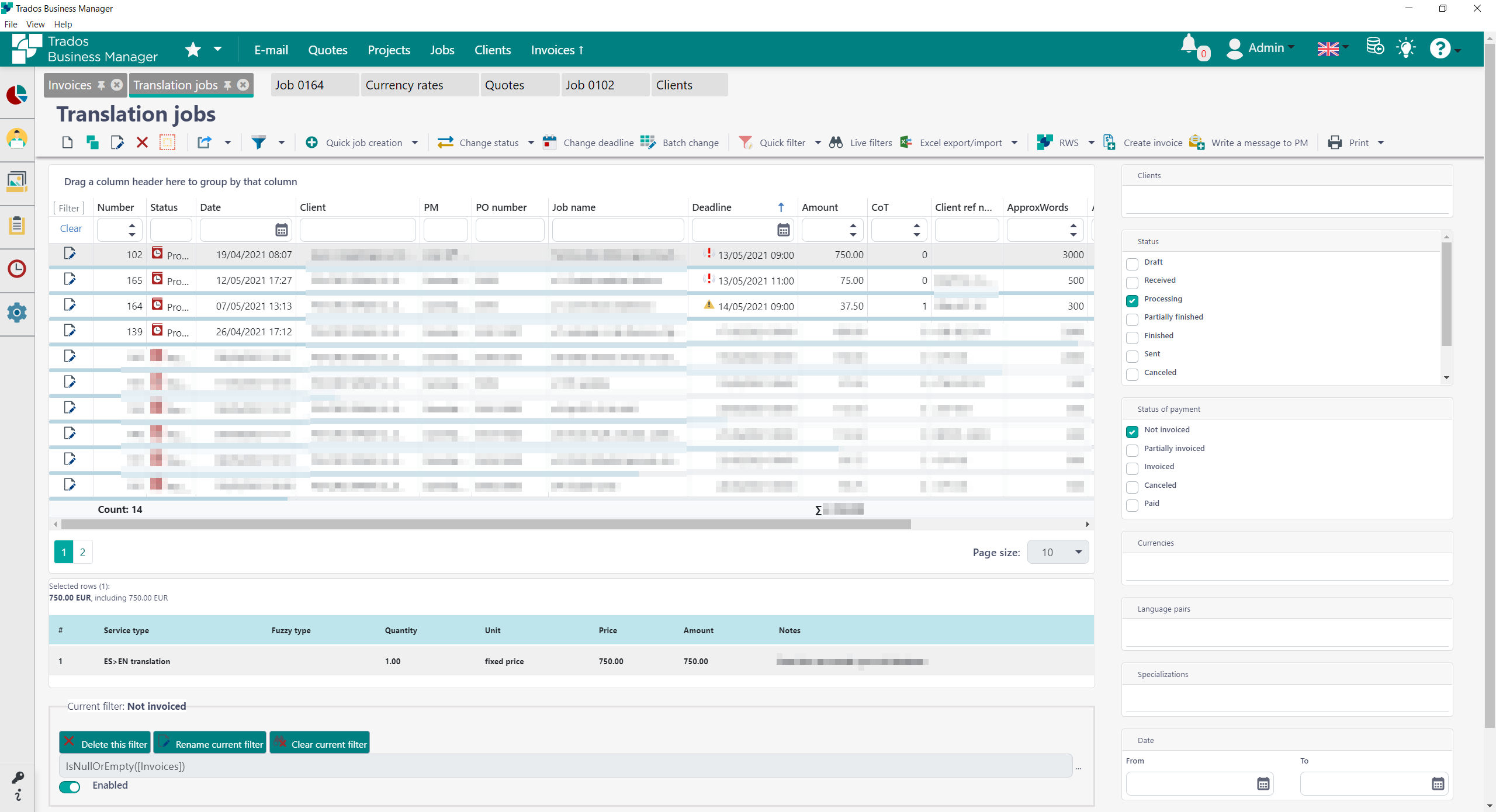 - Live filter in job list: quickly display by job status (processing, sent, etc.), payment status, client and date range