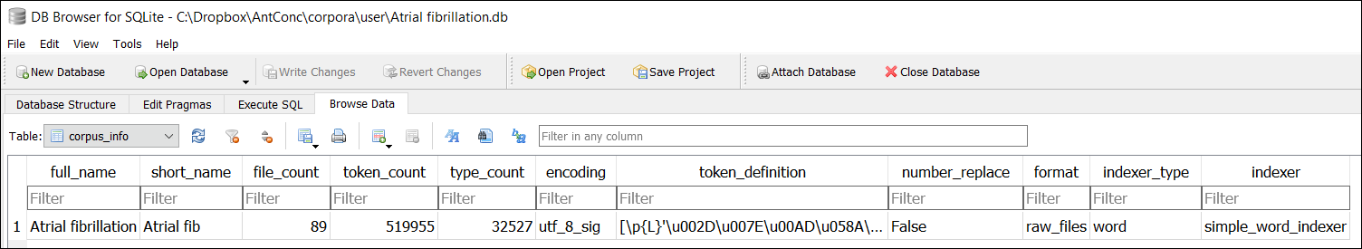 Corpora are compiled as databases that can be browsed and edited in SQLite-compatible tools. I’ve tinkered in DB Browser for SQLite to compile word lists and edit corpus names. Tip: make a copy of your corpus before you dive in!