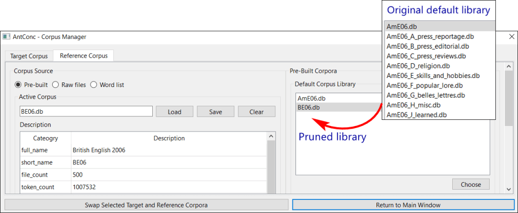 Before, the main window had to be populated with files every time at start-up. Now, you can quickly select a corpus or sub-corpus with the shortcut Ctrl+O (File tab > Open Corpus Manager). AntConc v.4 comes bundled with two large general written corpora, AmE06[ii] and BE06[iii], each containing 500 files and a total of one million words in American or British English, respectively, compiled in 2006. Apart from using them to perform general language queries as a target corpus, you can add them as a reference corpus when investigating word frequency and usage in specialised, custom-built corpora. The default library [AntConc>Corpora>default] was brimming with field-specific subcorpora that I’m unlikely to use, so I moved them out to navigate the library more easily:
