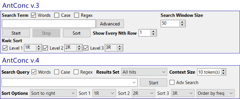 Still in the KWIC tool, left/right sorting is simpler and more intuitive. The rather confusing legacy tick boxes are gone, replaced by sort options that automatically switch the search to the corresponding side, with dropdowns for selecting sort depth. In fact, all the search query options are more logically labelled and easier to understand than before:
