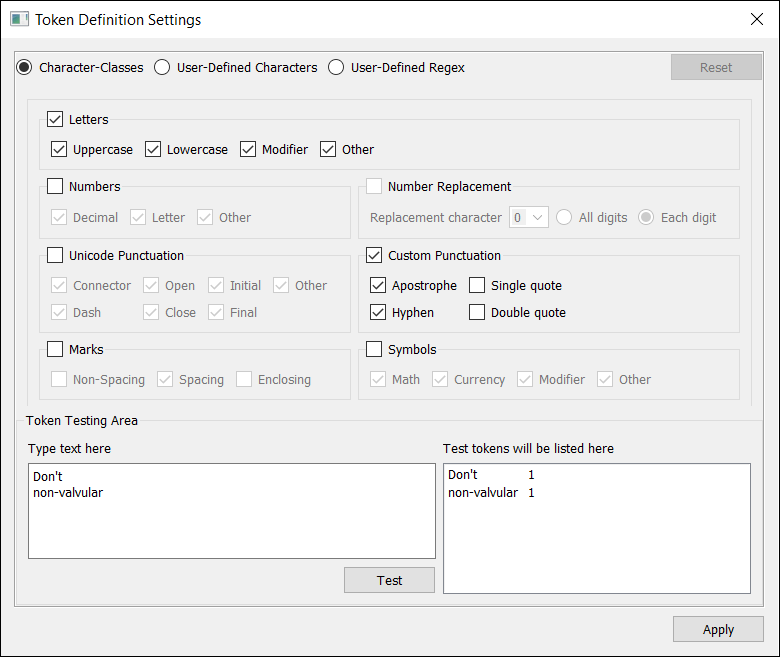 When creating a new corpus, AntConc will identify and tag all the tokens (words). By default a token consists of upper and lowercase letters only but you can tweak the definition to add other characters. I’ve included apostrophes and hyphens to improve word recognition. The Token Testing Area sandbox lets you enter words or sentences to check the outcome before applying the changes: