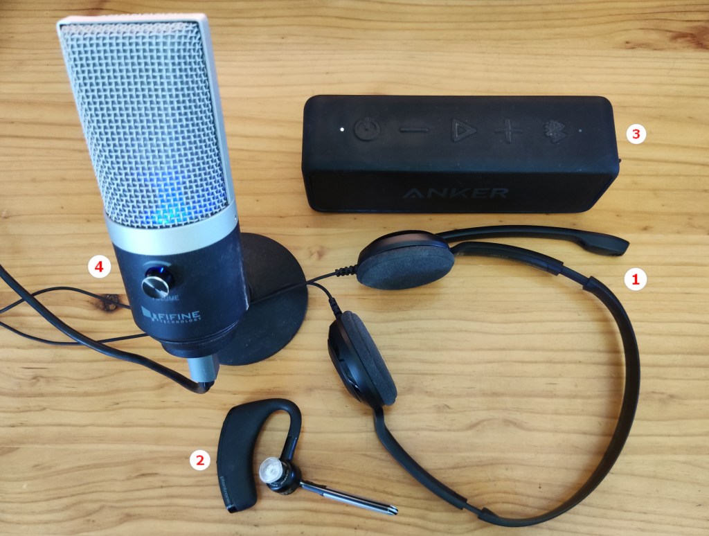 So I dug up Dragon V15, installed it and then wondered which microphone to use. Putting on headphones with a single hand defies the laws of nature. Try it yourself – maybe you have the knack – and then keep them on for hours. I found that even my lightweight Sennheiser headset1 made my ears sore. A single earpiece2 proved equally tricky to put on and Dragon struggled with its Bluetooth connection. Finally, I settled on an Anker speaker3 combined with a desktop microphone4, which Dragon picked up well with the mic positioned about 12 inches away.