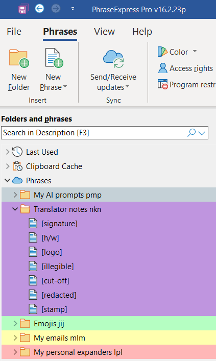 Dragon integrates well with PhraseExpress, an app that stores frequently used word strings, phrases and email templates, and expands them automatically with a hotkey or text trigger. To adapt PhraseExpress to Dragon, I grouped my items as pop-up menus to appear when I give the cue. For example, nkn calls up a list of notes I often add in square brackets to my translations ([illegible], [redacted], [signature], etc.) and mlm displays my email templates. PhraseExpress is a nifty time saver in normal working mode and a life saver in broken-arm mode. It’s more user-friendly than AutoHotKey and more flexible when working with Dragon.