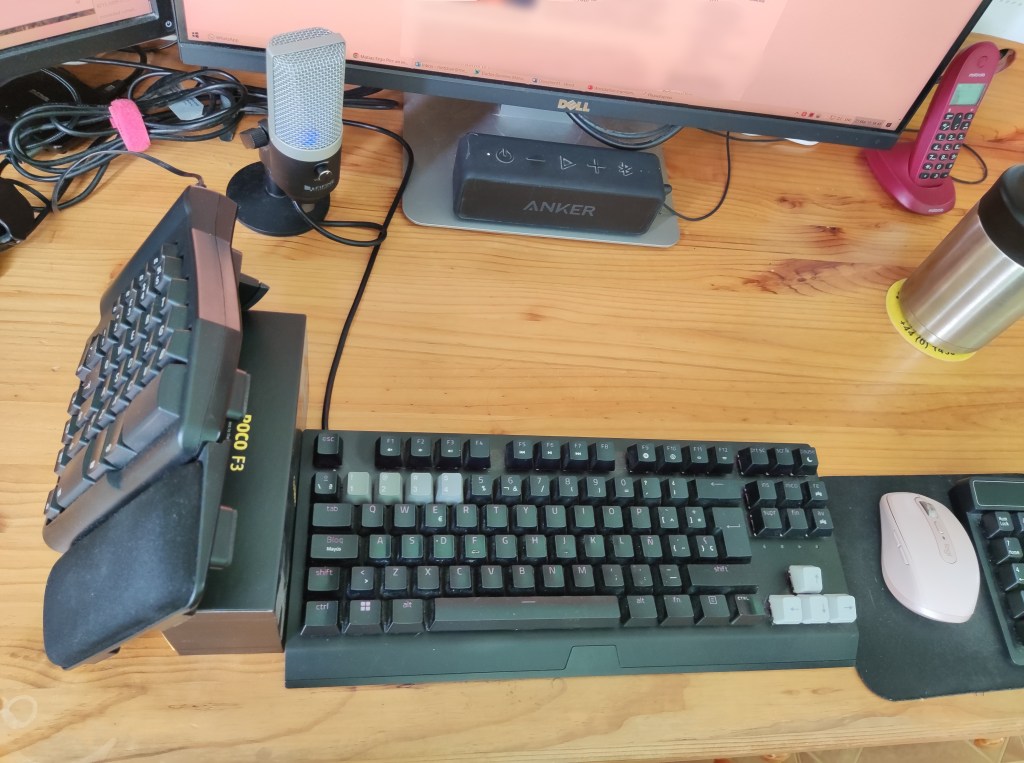 Prototype 1 took the shape of a half Matias Ergo Pro keyboard raised to my left and balanced on top of my cat’s playbox (cat included). Typing with two keyboards worked well, but my arm soon tired.